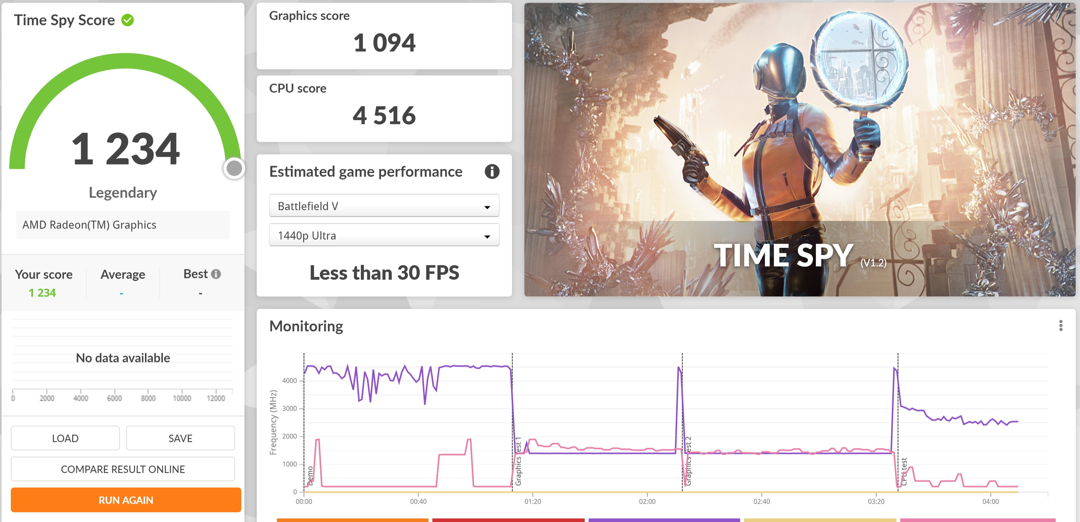 Ytelsen er god nok til surfing, dokumenter og enkel bilde- og videobehandling. I benchmarks viser den bærbare PC-en svært gode resultater i CPU- og ytelsestester. Med tung grafikk er resultatene som forventet mer beskjedne. Det er ikke overraskende, med tanke på den innebygde akseleratoren.
