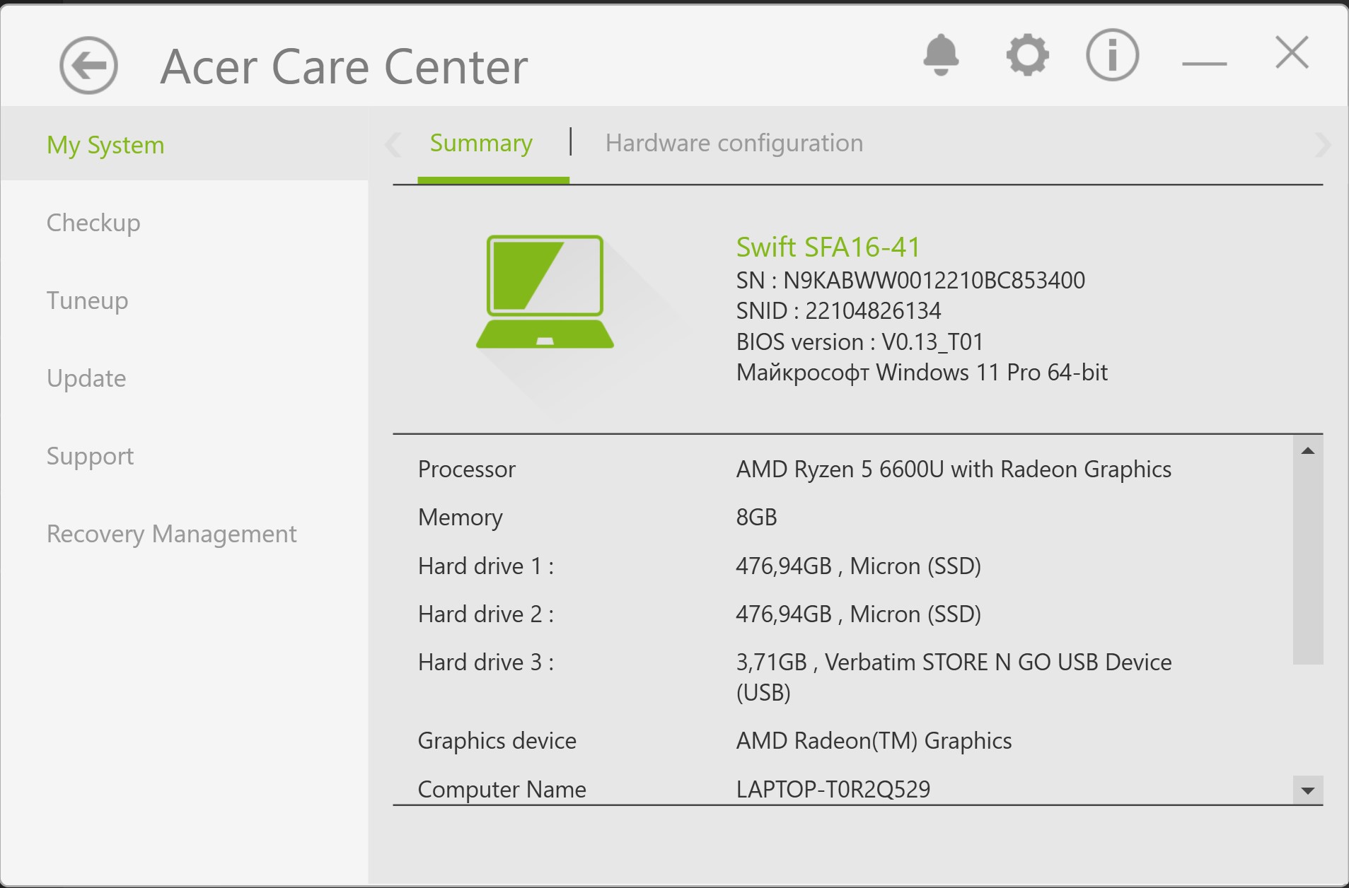 Den bærbare datamaskinen har to høyttalere, og volumet er tilstrekkelig for filmer og YouTube-videoer. Og audiofile bør fortsatt koble til en ekstern høyttaler. Av nyttige proprietære applikasjoner er Acer Care Center verdt å nevne. Den har all statistikk om bruk av den bærbare datamaskinen og alternativer for rengjøring, optimalisering og oppgradering.