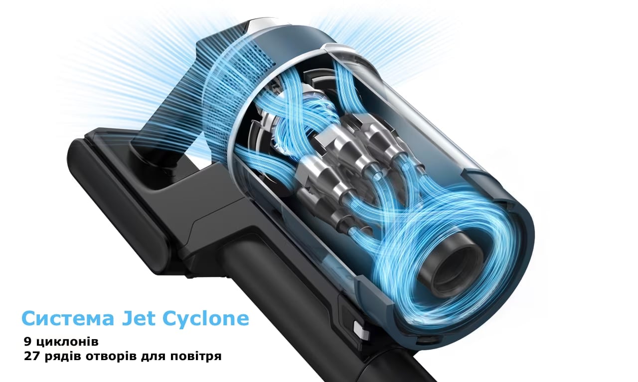 Et viktig filtreringstrinn er Jet Cyclone-systemet, som ved hjelp av 9 sykloner skaper virvler i luften og leder dem inn i åpninger som er plassert i 27 rader. Som produsenten påpeker, bidrar det til å rengjøre mer effektivt, fordi det er dette mønsteret som øker sugeeffekten og sikrer bedre rengjøring.