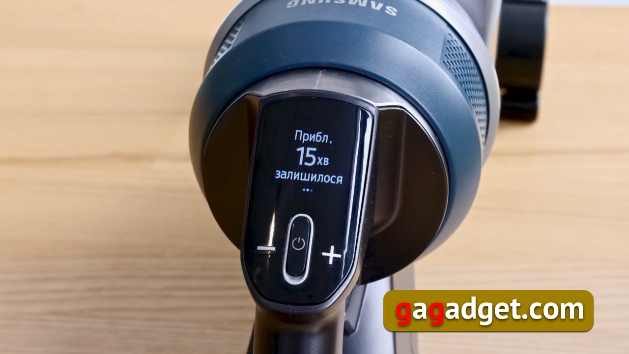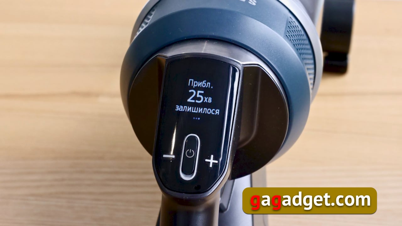 Displayfunksjonene var mer omfattende enn jeg hadde håpet. For det første viser den batterinivået under lading. For det andre viser det driftsmodus (det er fire) og forventet batterilevetid. Det brukes også til å vise servicemeldinger (f.eks. feilmeldinger - hindringer for luften og behovet for å fjerne rusk som hindrer luften) eller for å minne deg på at det er på tide å rengjøre filtrene. Displayet brukes også til våtrengjøring når støvsugeren har påmontert en børste.