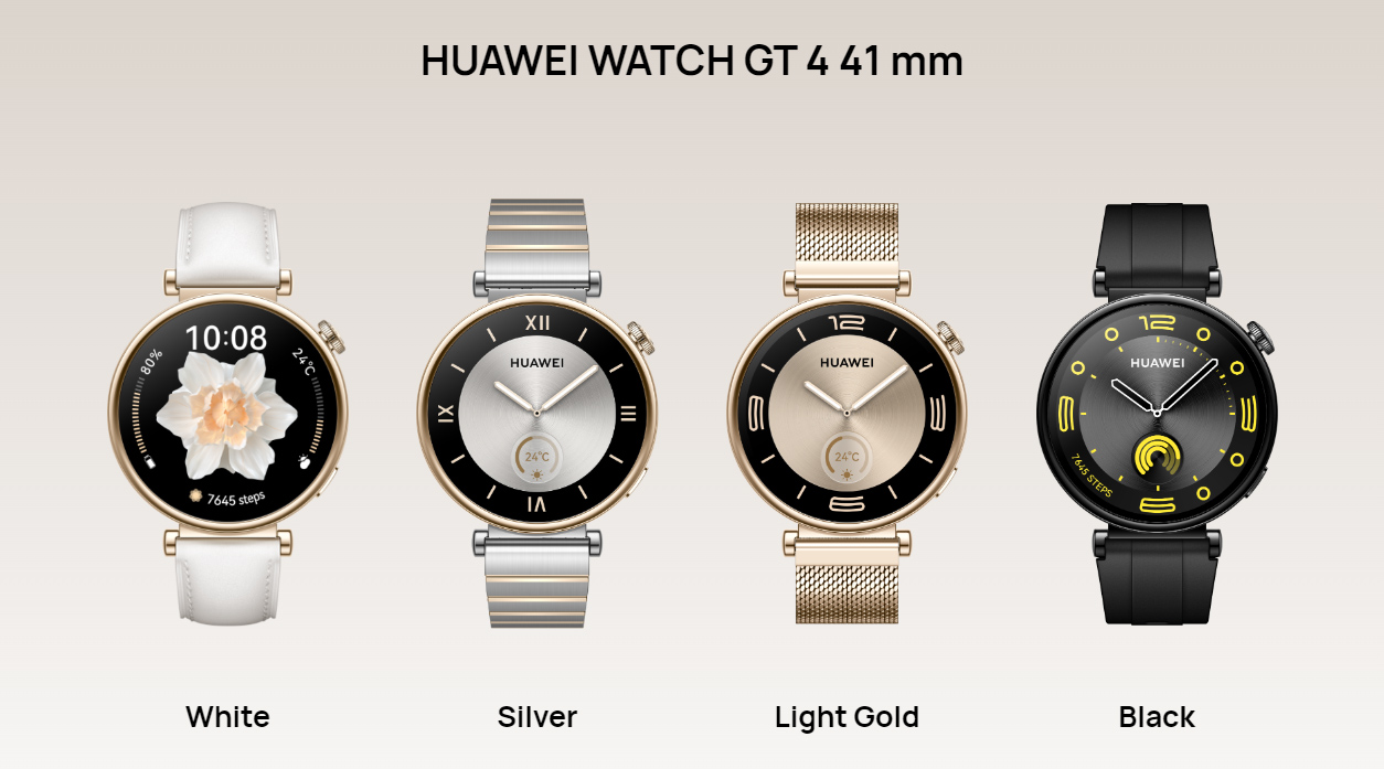 Huawei Watch GT4 er tilgjengelig i to varianter. Den første har en størrelse på 41 mm. Klokken er utstyrt med en AMOLED-skjerm med en oppløsning på 466 x 466 piksler og en diameter på 1,32". De kan brukes i to dager med Always-on Display-modus aktivert. Maksimal driftstid uten lading er 7 dager.