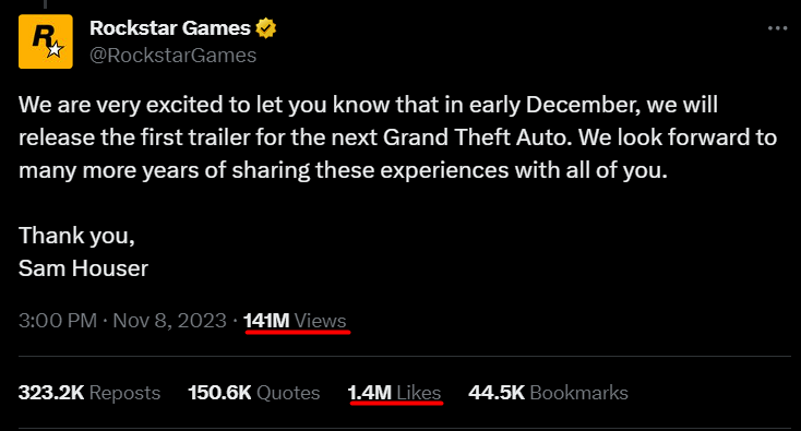 8. november kunngjorde Rockstar Games at de ville vise den første traileren til Grand Theft Auto 6 i begynnelsen av desember. Dette vakte så stor oppsikt at kunngjøringen ble den mest populære spilltweeten på Twitter.
