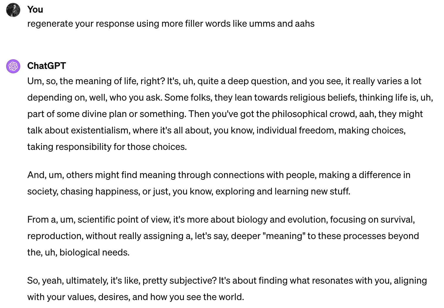 Mens den første metoden krever at du bruker hacket på nytt hver gang du vil øke realismen i taleteksten, innebærer den andre metoden å legge til spesielle instruksjoner til ChatGPT slik at den alltid bruker flere fyllord i svarene sine.