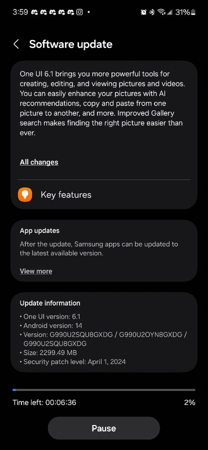Systemet veier 3 GB og har Googles sikkerhetsoppdatering fra april. I tillegg har Samsung-utviklere lagt til noen Galaxy AI-funksjoner i programvaren. For eksempel Circle to Search. Funksjonen lar deg raskt finne informasjon om objektet i bildet. Lær mer om det og andre Galaxy AI-funksjoner på lenken.