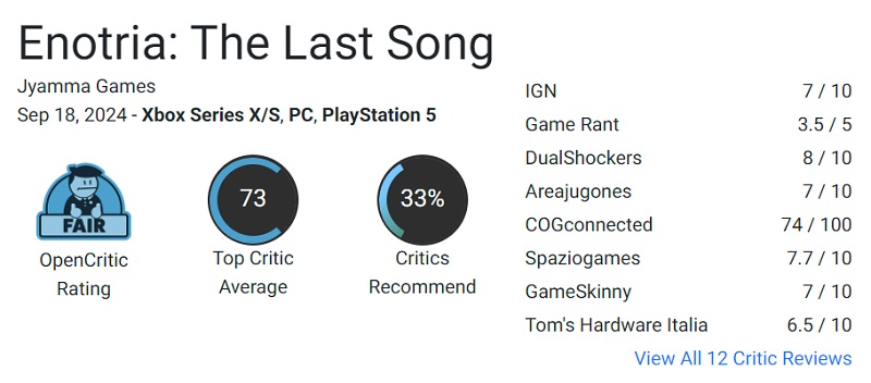 På Steam, Enotria: The Last Song mottar "for det meste positive anmeldelser", men kritikere har vurdert spillet strengere: