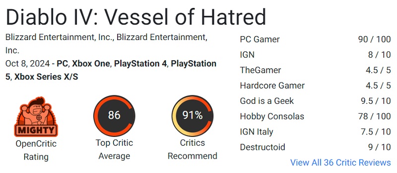 Generelt kalles utgivelsen av Vessel of Hatred en god grunn til å gå tilbake til Diablo IV, og når det gjelder ulempene, er den viktigste prisen på DLC. Noen anmeldere tviler på at 9-10 timers spilletid er verdt $ 40 og foreslår at spillere venter på rabatt.