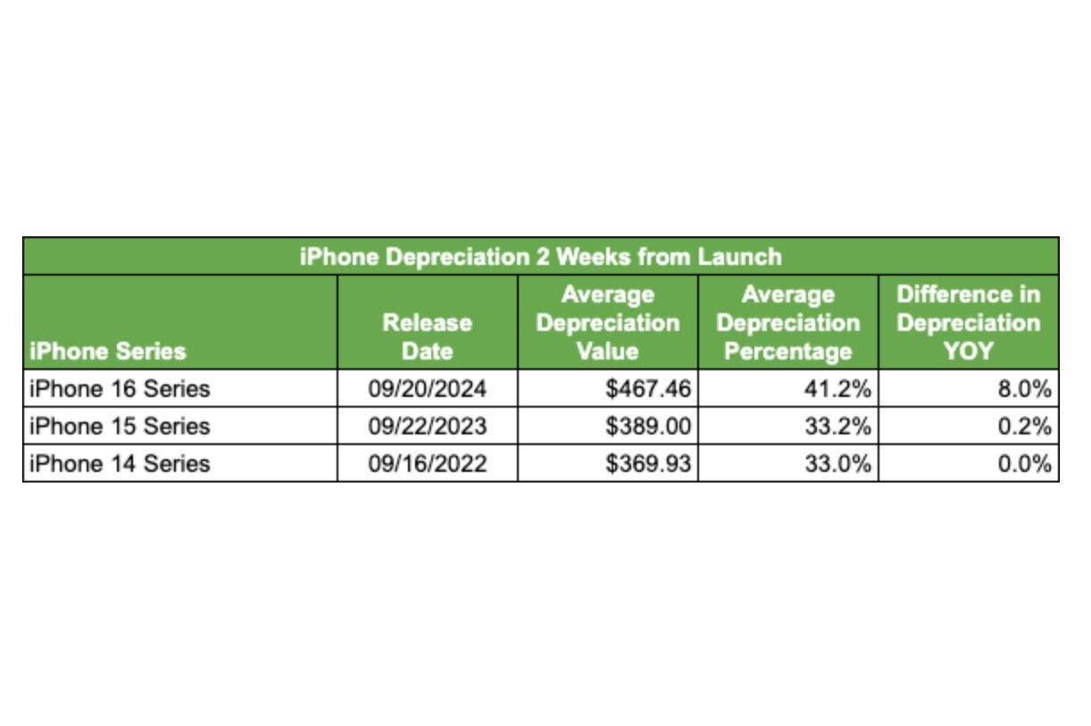 Handelsplattformen SellCell for smarttelefoner og nettbrett analyserte innbyttedata fra mer enn 40 leverandører av tilbakekjøpstjenester og fant at iPhone 16-serien mistet 41 % av sin verdi på bare to uker etter lansering, mens iPhone 15 og iPhone 14 mistet rundt 33 % i samme periode. I løpet av året mistet iPhone 15 48 prosent av sin verdi, 0,5 prosent mer enn iPhone 14, mens iPhone 13 mistet 46 prosent, 2,4 prosent mer enn iPhone 12.
