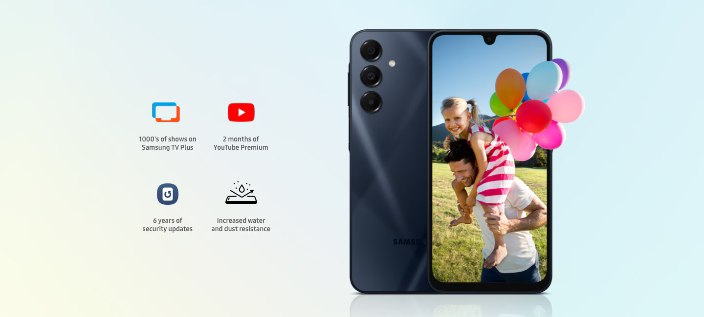 Hovedkameraet har tre moduler: 50 megapiksler, 5 megapiksler (ultrabred) og 2 megapiksler (makro). Batteriet på 5000 mAh støtter 25W hurtiglading. Andre funksjoner inkluderer IP54, NFC og en fingeravtrykkskanner på siden. Smarttelefonen mangler imidlertid en lydkontakt, som forgjengeren, Galaxy A15 5G.