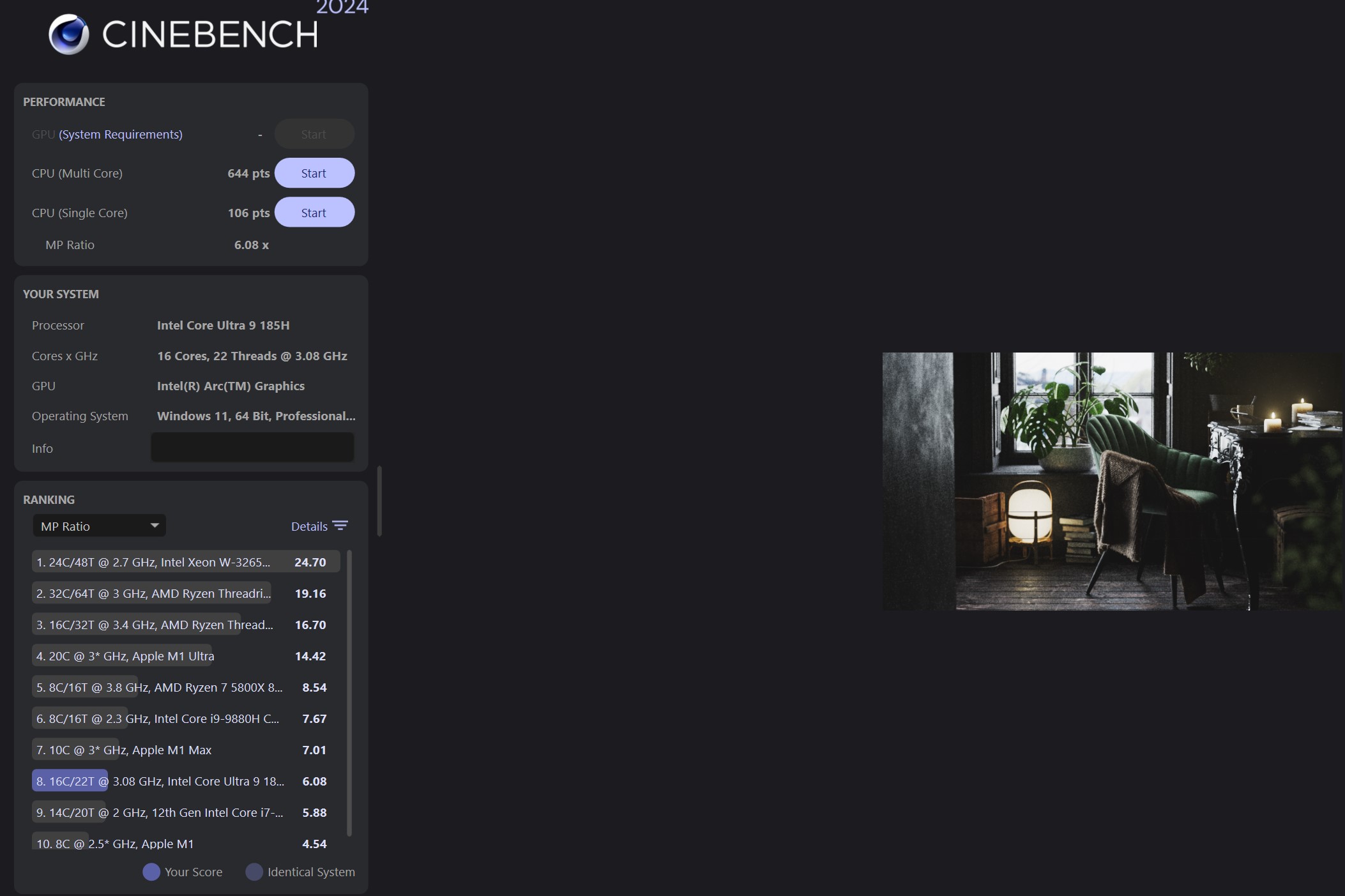 | Prosessor. | Intel Core Ultra 9 185H (opptil 5,1 GHz), 16 (6+8+2) kjerner, 22 tråder, (Meteor Lake) |