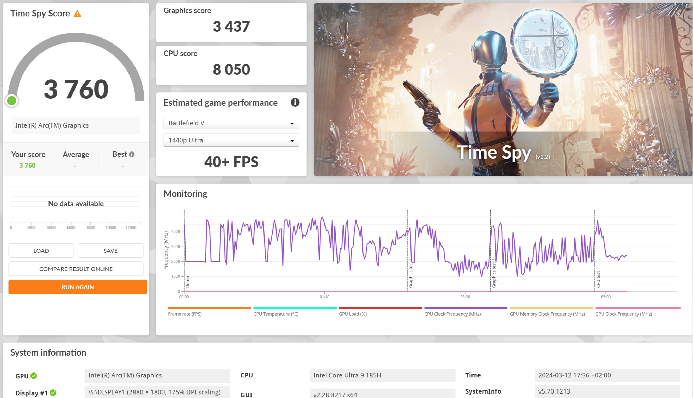 Vi var nysgjerrige på hva den nye innebygde Arc-grafikken er i stand til, så vi kjørte et par relativt nye spill på den bærbare datamaskinen. Det viste seg at GPU-akseleratorens kraft er nok til å oppnå et akseptabelt FPS-nivå i native oppløsning.