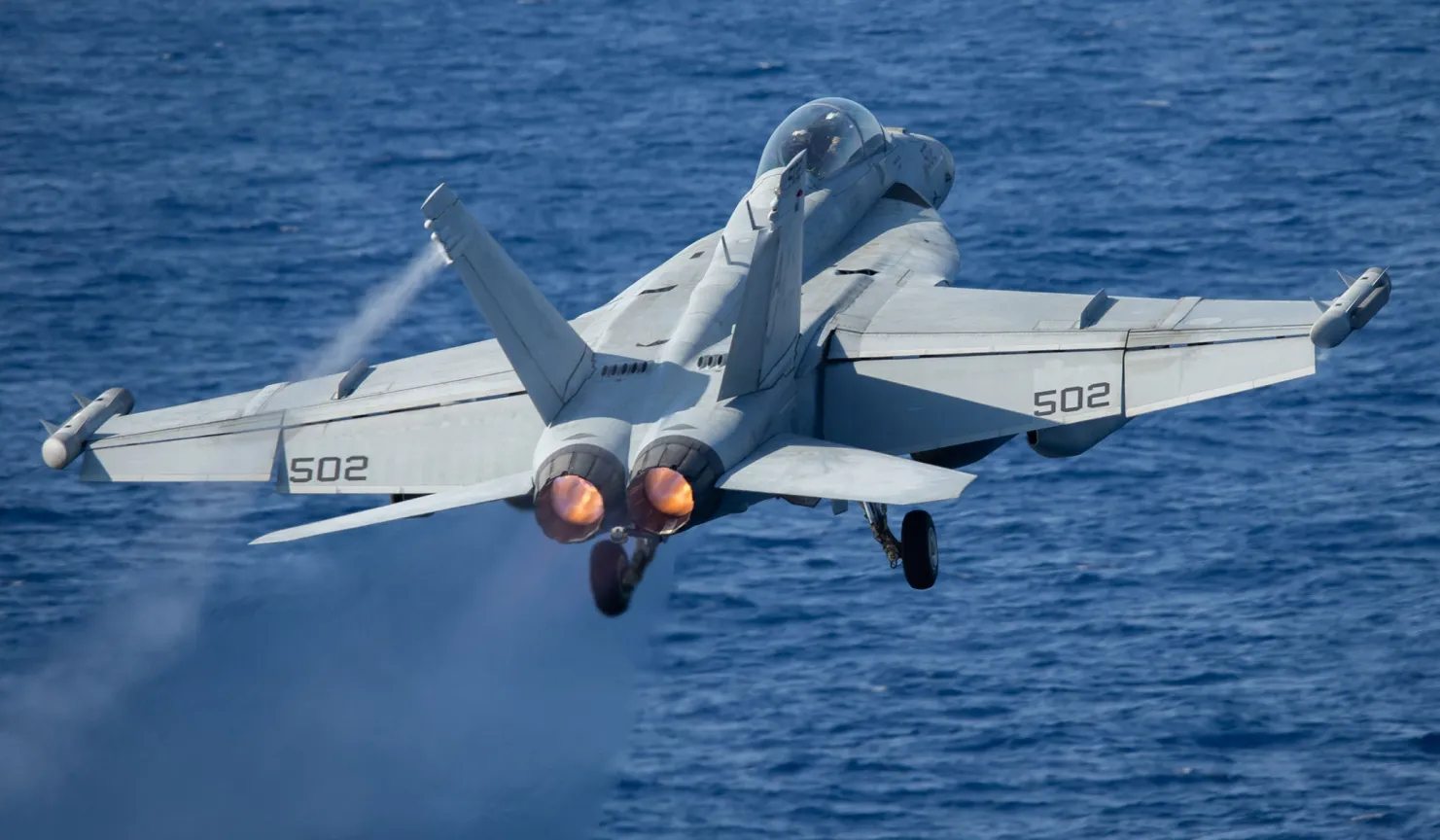 USS Gerald R. Ford, verdens største hangarskip til over 13 milliarder dollar, med F/A-18 Super Hornet-kampfly på patrulje i Adriaterhavet.