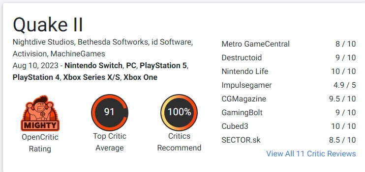 Den oppdaterte versjonen av Quake 2, som ble utarbeidet av det berømte Nightdive-studioet (som også står bak System Shock-remasteren), ble tatt godt imot av spillere og kritikere og får gode karakterer på alle plattformer.